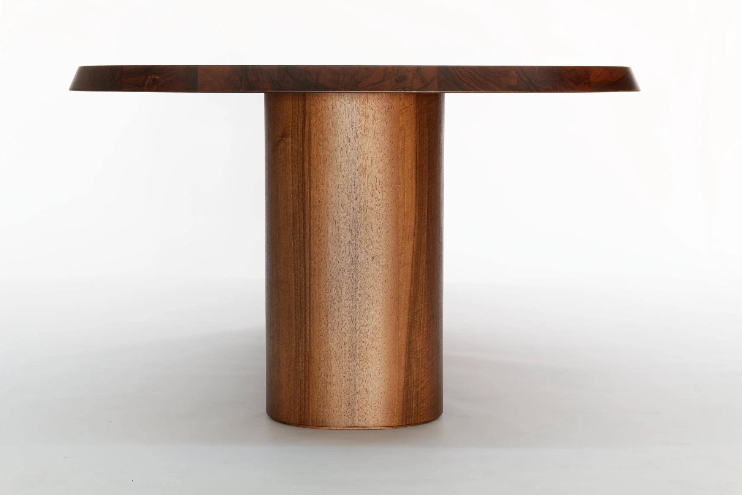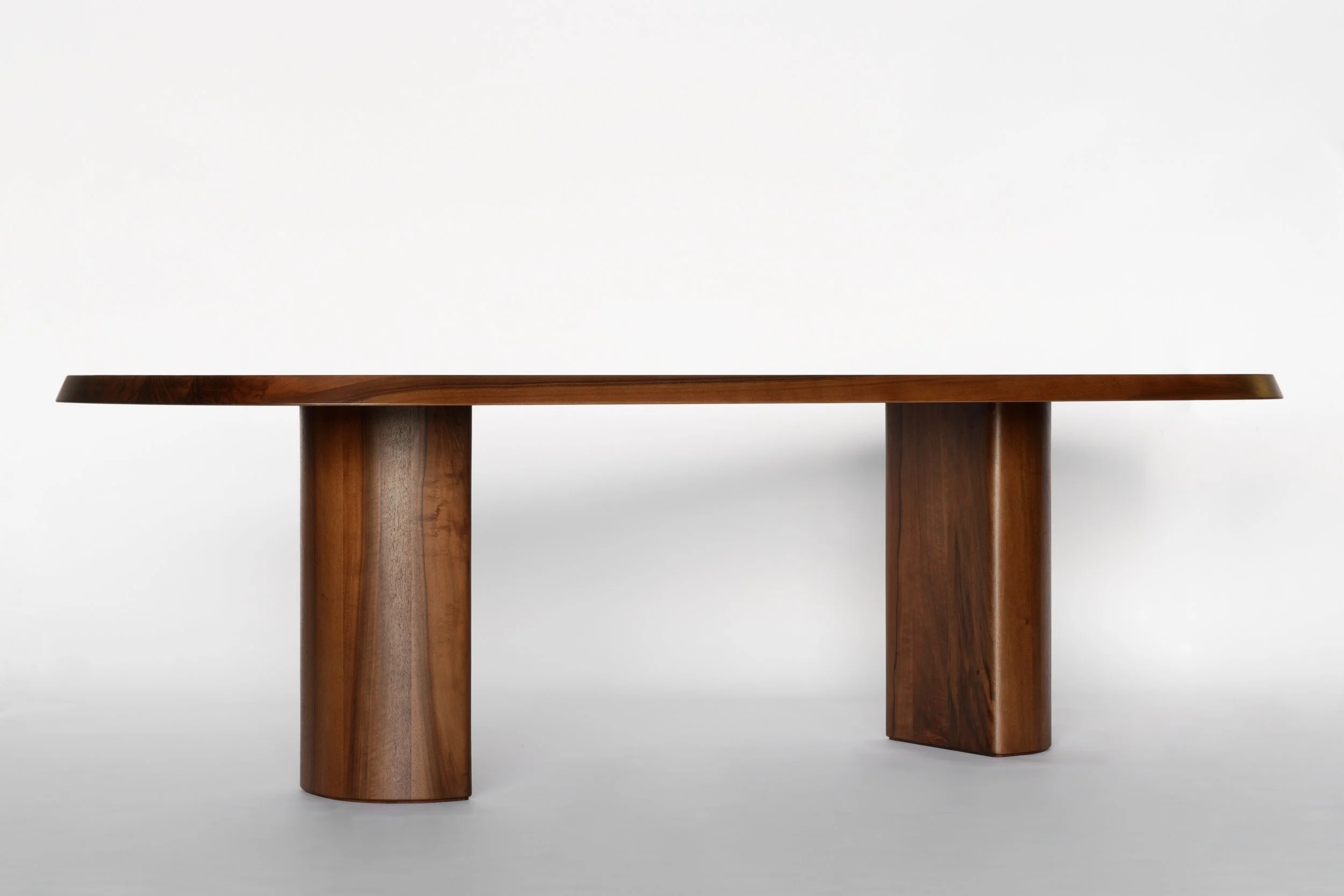 With its imposing volumes and two massive legs, the KI Oval table stands out as the dominant architecture in the room. This scale is offset by the fascinating pattern created by the wood grain, which is the only decoration on the KI table.